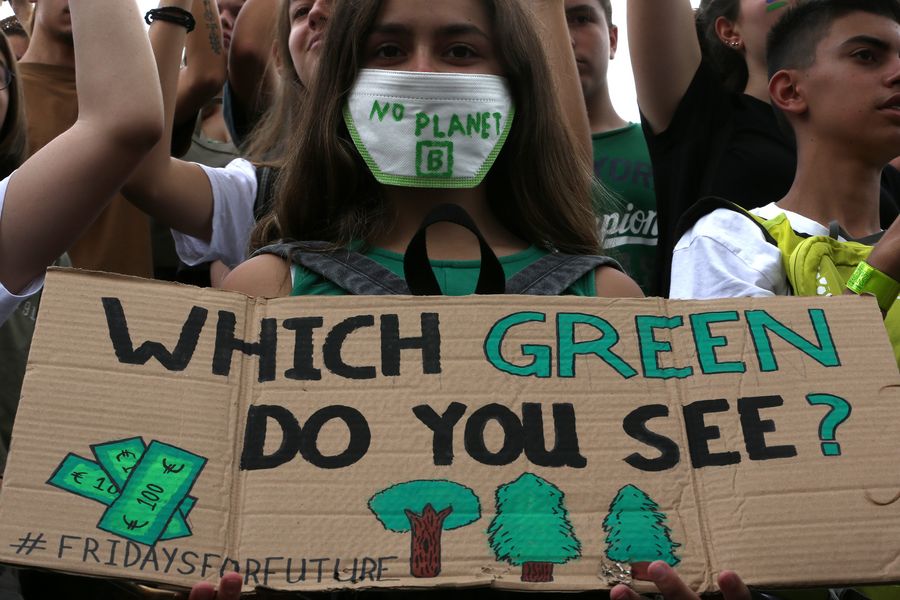 A Greek student holds a banner during a school strike for climate change in Athens, Greece, on Sept. 20, 2019. The School Strike for Climate on Fridays for Future (FFF) is an international movement of students who take time off from class to participate in demonstrations, in order to prevent further global warming and climate change. In Greece, high school students in 14 cities all over the country decided to skip classes, joining the initiative. (Xinhua/Marios Lolos)