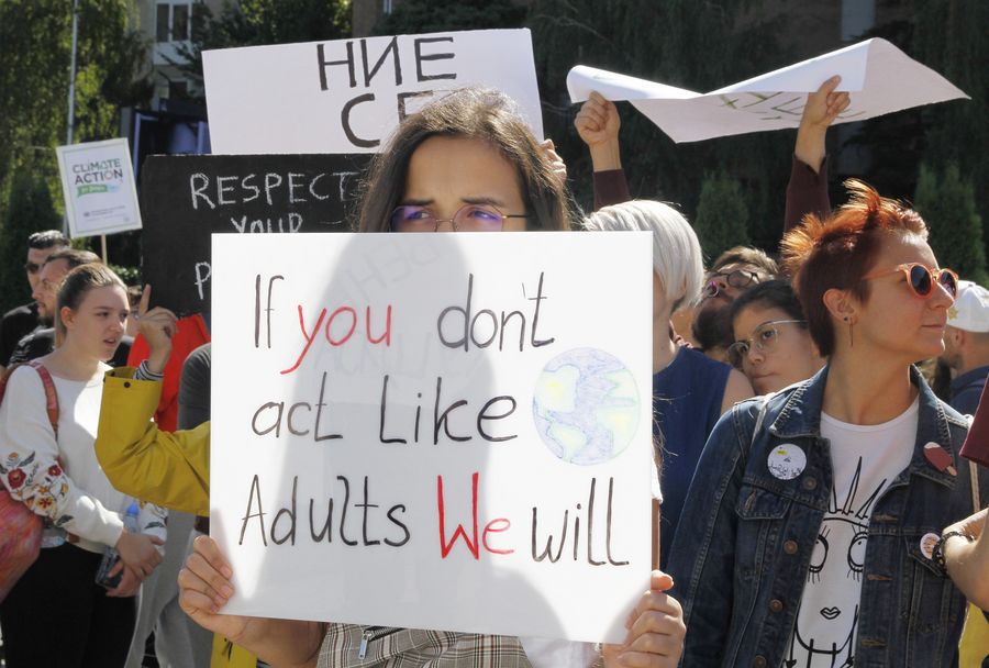 A high school student holds a placard during a rally against global warming in front of the government building in Skopje, North Macedonia, Sept. 20, 2019. (Photo by Darko Duridanski/Xinhua)