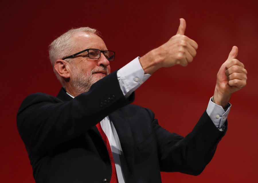 British Labour Party Leader Jeremy Corbyn gestures at the Labour Party Annual Conference 2019 in Brighton, Britain, Sept. 23, 2019. (Xinhua/Han Yan)