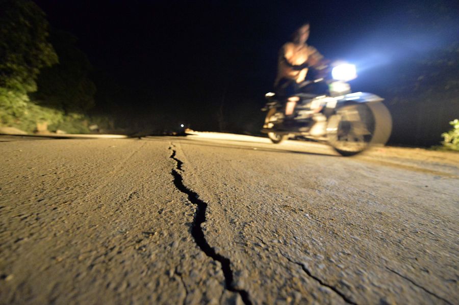A motorbike rider drives past a damaged road at the earthquake-hit area on the outskirts of Mirpur district of Pakistan-controlled Kashmir on Sept. 25, 2019. (Xinhua/Ahmad Kamal)