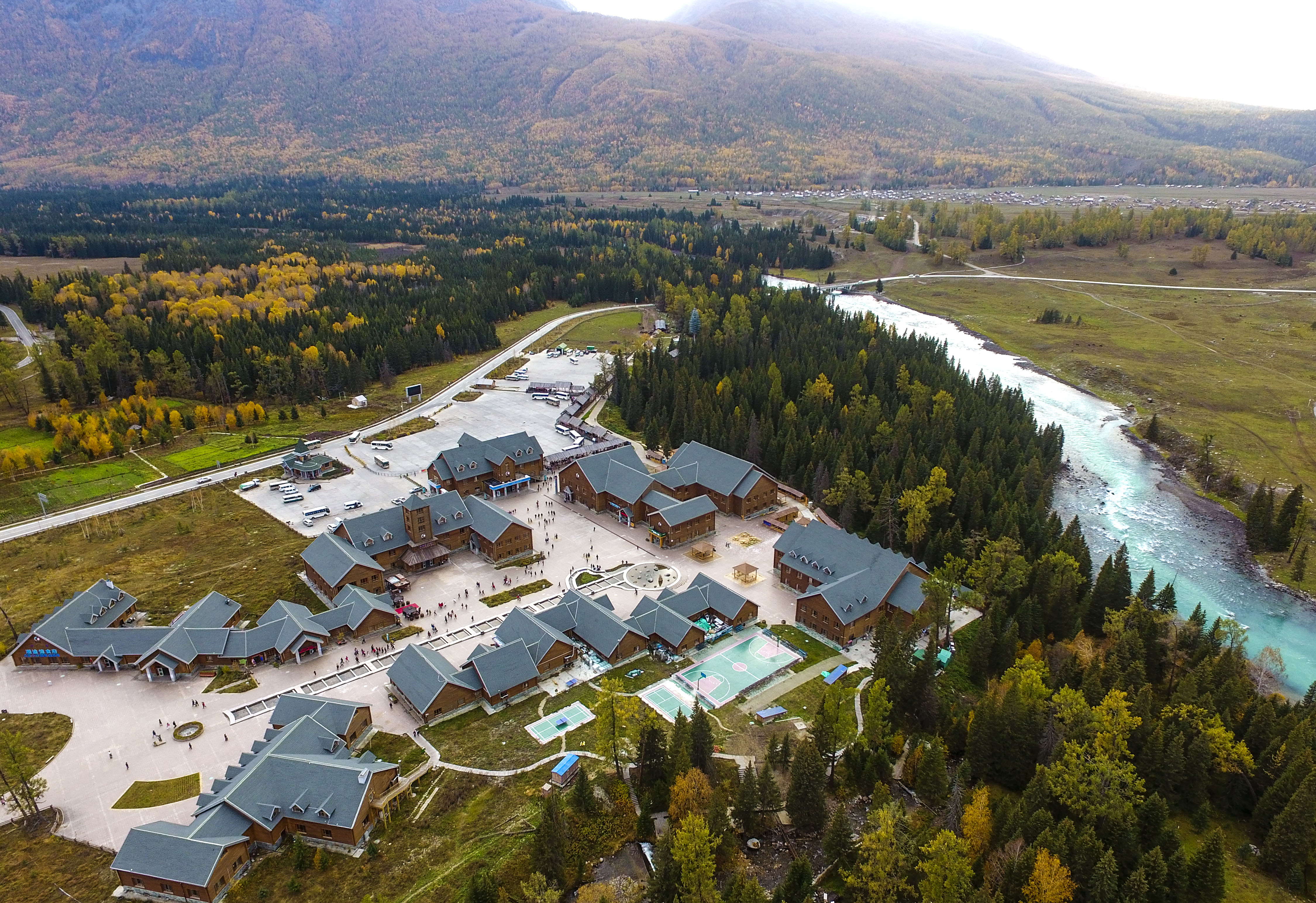 Aerial photo taken on Sept. 24, 2019 shows the visitor center of Kanas scenic spot in Altay, northwest China's Xinjiang Uygur Autonomous Region. (Xinhua/Ma Kai)