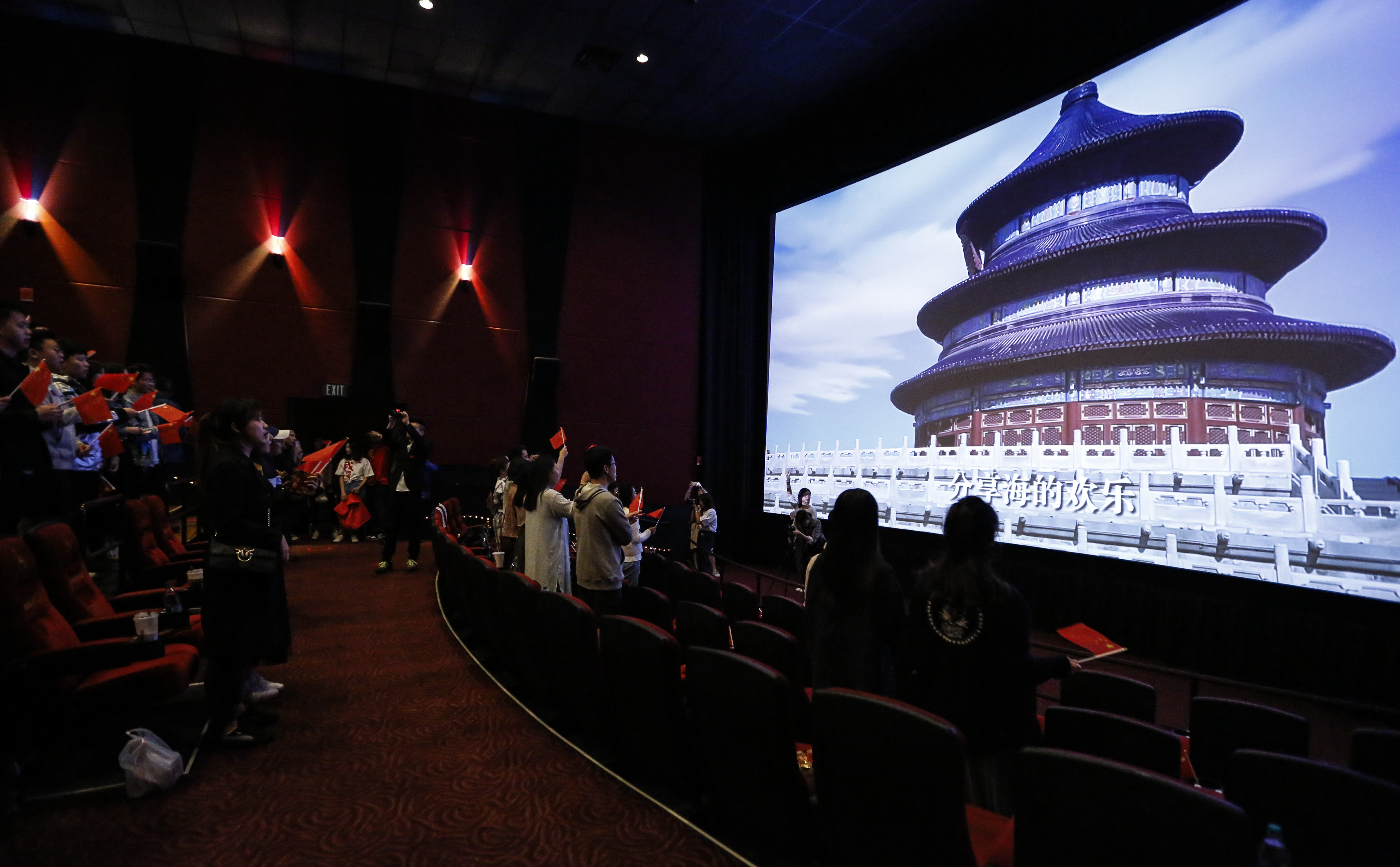 Audience sing "My People, My Country" together at the start of the homonymic movie during its premiere in Los Angeles, the United States, Sept. 30, 2019. (Xinhua/Li Ying)