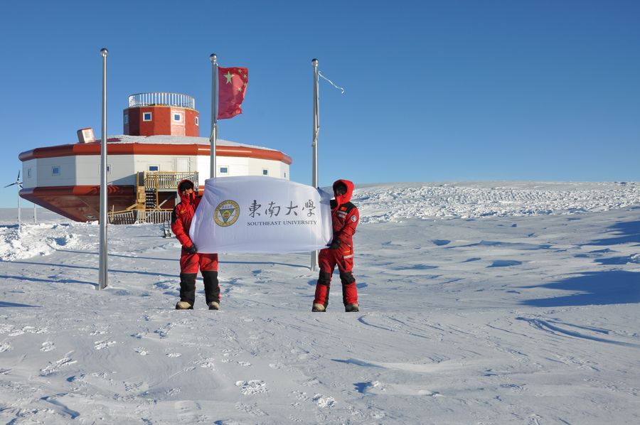 Experts from Southeast University show the university's flag at China's Taishan Station in Antarctica, Jan. 26, 2019.(Photo provided by Southeast University via Xinhua)