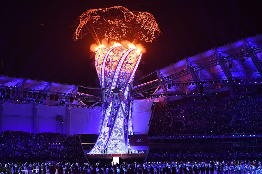 The cauldron is lit during the opening ceremony of the 7th International Military Sports Council (CISM) Military World Games in Wuhan, capital of central China's Hubei Province, Oct. 18, 2019.(Xinhua/Jiang Kehong)