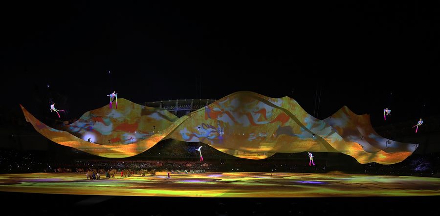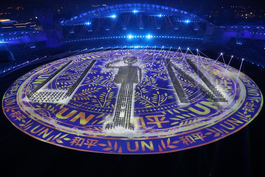 Photo taken on Oct. 18, 2019 shows the art performance during the opening ceremony of the 7th CISM Military World Games in Wuhan, capital of central China's Hubei Province. (Xinhua/Liu Xu)