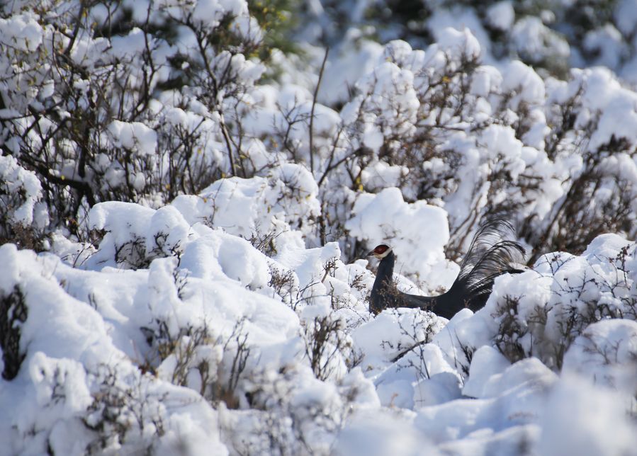 Acrossoptilon auritum, a rare bird in China, forages in the snowfield, Oct.12, 2019. (Photo provided by Wang Chao)