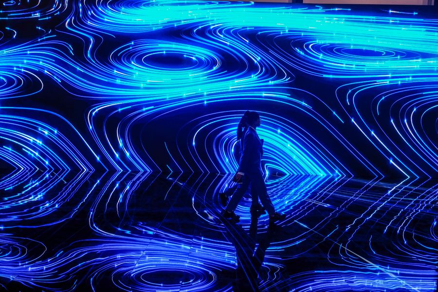 Staff members walk by a giant screen in Wuzhen International Internet Exhibition and Convention Center in Wuzhen, east China's Zhejiang Province, Oct. 19, 2019. The 6th World Internet Conference is scheduled to take place here from Oct. 20 to 22. (Xinhua/Xu Yu)