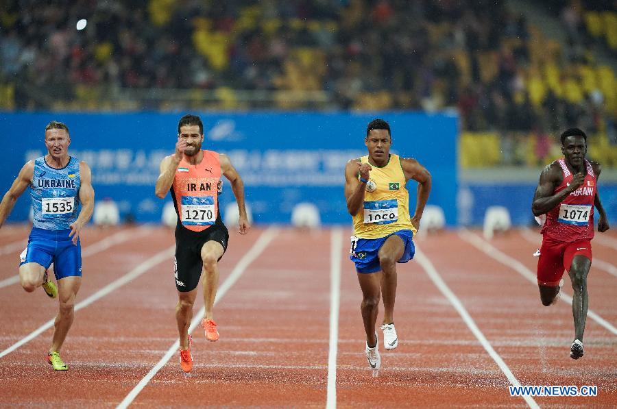 Athletes compete during the men's 100m final of track and field at the 7th CISM Military World Games in Wuhan, capital of central China's Hubei Province, Oct. 22, 2019. (Xinhua/Chen Yehua)