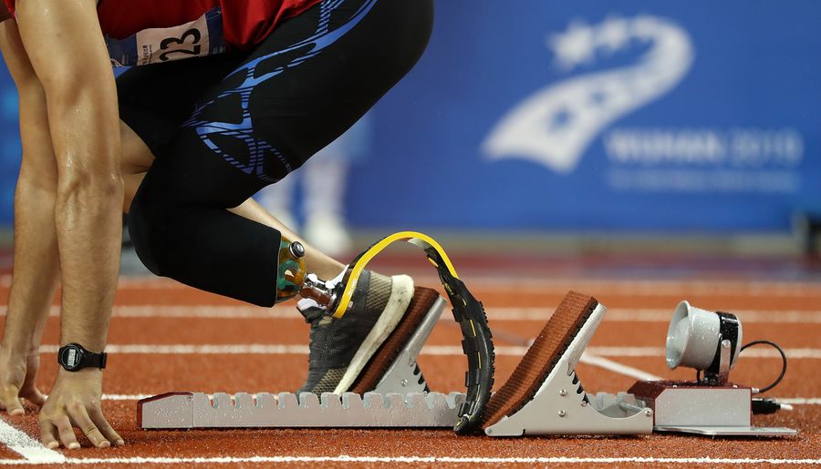 Jeber Naghmouchi of Tunisia prepares before the disabled men's 400m IT1 final of track and field at the 7th CISM Military World Games in Wuhan, capital of central China's Hubei Province, Oct. 22, 2019. (Xinhua/Wang Lili)