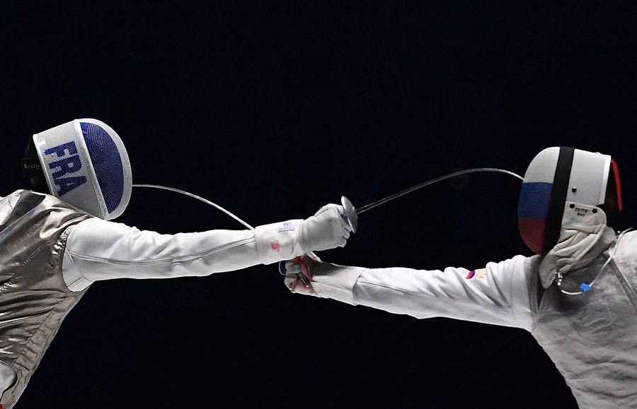 Timur Safin (R) of Russia competes with Enzo Lefort of France during the team competition of the men's foil of fencing at the 7th CISM Military World Games in Wuhan, capital of central China's Hubei Province, Oct. 22, 2019. (Xinhua/Wan Xiang)