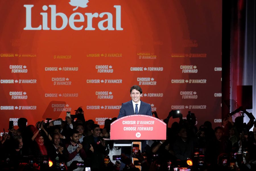 Canadian Prime Minister Justin Trudeau addresses party members at the Liberal Party campaign headquarters in Montreal, Canada, Oct. 21, 2019. Canadian Prime Minister Justin Trudeau's Liberal Party won the 2019 Canadian federal election Monday night, according to Elections Canada on Tuesday. (Photo by Raffi Kirdi/Xinhua)