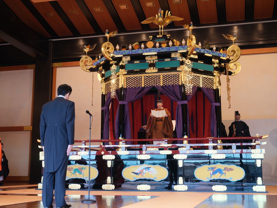 Japanese Emperor Naruhito (C) and Prime Minister Shinzo Abe (L) attend the emperor's coronation ceremony in the Seiden State Hall at the Imperial Palace in Tokyo, Japan, Oct. 22, 2019. Japanese Emperor Naruhito on Tuesday proclaimed his enthronement in a highly ritualized, ancient-style ceremony held in the Seiden State Hall at the Imperial Palace in Tokyo in front of 2,000 guests from around the world. (Xinhua)