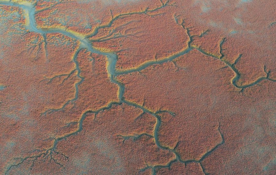 Aerial photo taken on Oct. 22, 2019 shows a view of the Honghaitan Red Beach scenic area in Panjin, northeast China's Liaoning Province. (Xinhua/Long Lei)