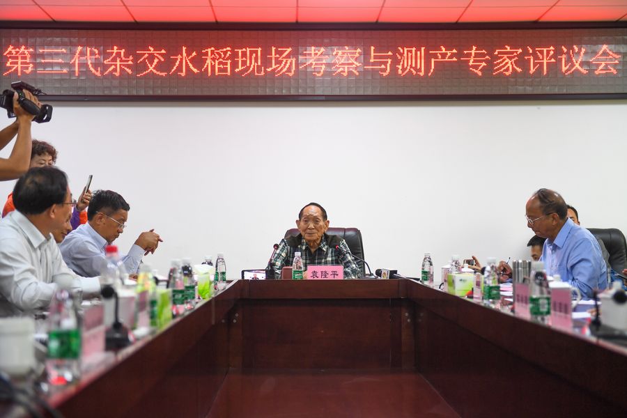 Photo taken on Oct. 22, 2019 shows Yuan Longping (C), the "father of hybrid rice", at an appraisal meeting in central China's Hunan Province. The third-generation hybrid rice developed by Yuan Longping, the "father of hybrid rice," and his team underwent its first public yield monitoring from Monday to Tuesday and achieved high output. The final yield of the tested variety, G3-1S/P19, came to 1,046.3 kg per mu (about 667 square meters), based on two plots of land in Qingzhu Village under the city of Hengyang in Hunan. (Xinhua/Chen Zeguo)