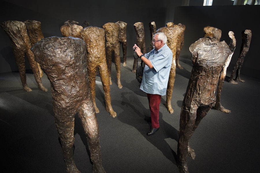 A visitor takes photos of a set of bronze figures named "Caminando" by artist Magdalena Abakanowicz at the Desa Unicum gallery in Warsaw, Poland, Oct. 21, 2019. The set of sculptures "Caminando" by artist Magdalena Abakanowicz and a sculpture "Dancer with the finger on the chin" by Antonio Canova are to be auctioned at the end of this month. (Photo by Jaap Arriens/Xinhua)