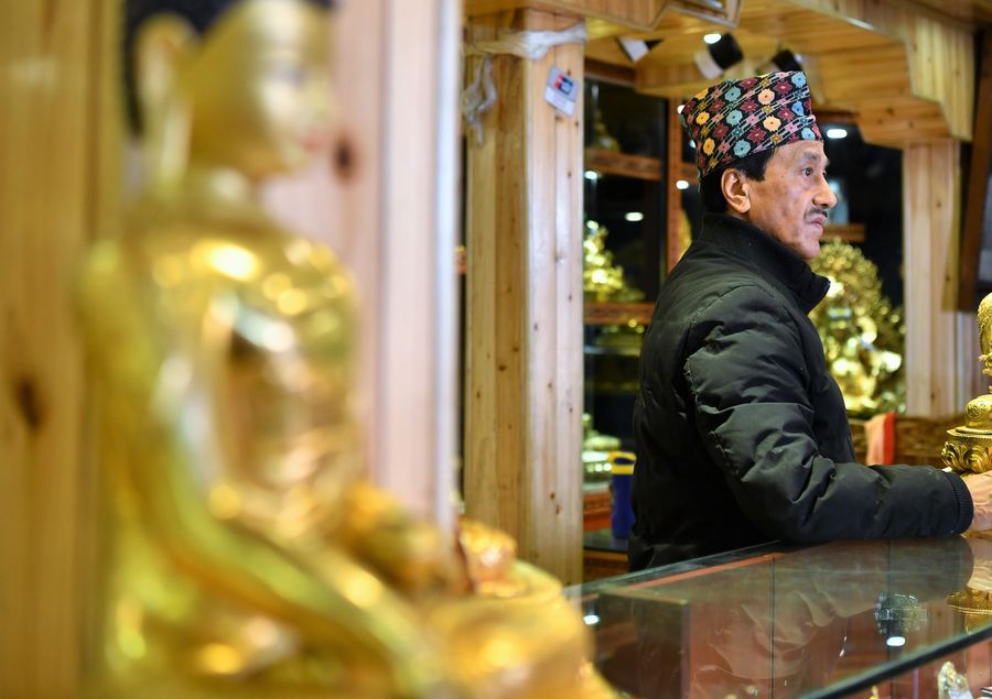 Ratna Kumar Tuladhar, a Nepali merchant and owner of Syamukapu Nepali Shop, is seen in his shop in Lhasa, southwest China's Tibet Autonomous Region, Oct. 14, 2019. Covering an area of no more than 100 square meters, a century-old store catches the eyes of pedestrians in Barkhor Street in central Lhasa, with its traditional Tibetan furnishing on the front and a sign inscribed with the name in Tibetan, Chinese and English -- Syamukapu Nepali Shop. (Xinhua/Li Xin)