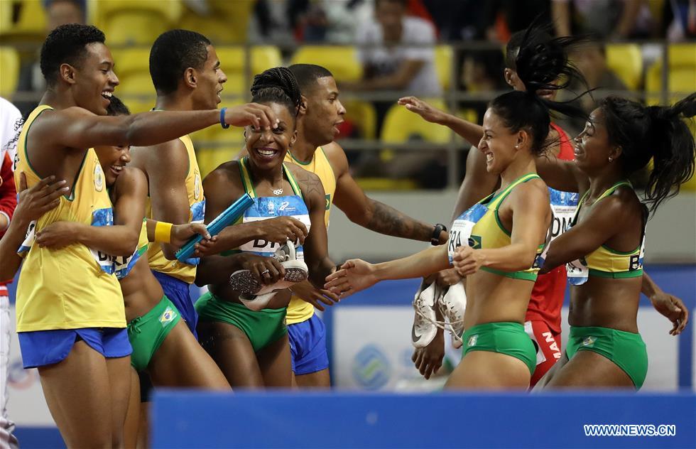 Team Brazil celebrate after 4x100m relay finals of track and field at the 7th CISM Military World Games in Wuhan, capital of central China's Hubei Province, Oct. 24, 2019. (Xinhua/Wang Lili)