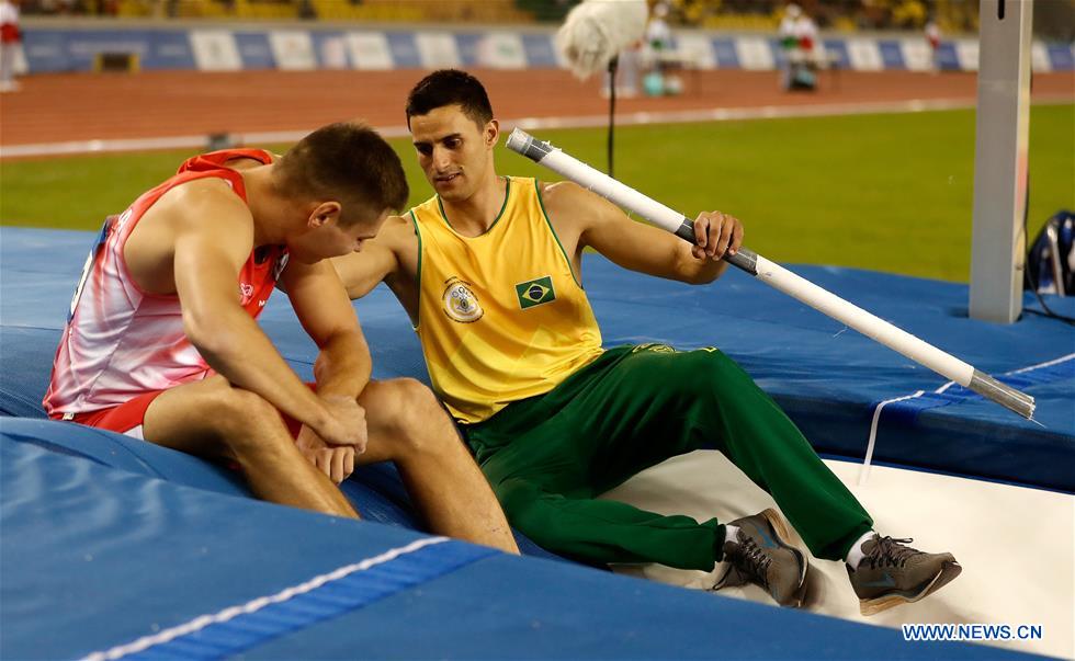 Augusto Dutra (R) of Brazil checks the condition of Pawel Wojciechowski of Poland after he got injured due to his broken pole during the men's pole vault final of track and field at the 7th CISM Military World Games in Wuhan, capital of central China's Hubei Province, Oct. 24, 2019. (Xinhua/Wang Lili)