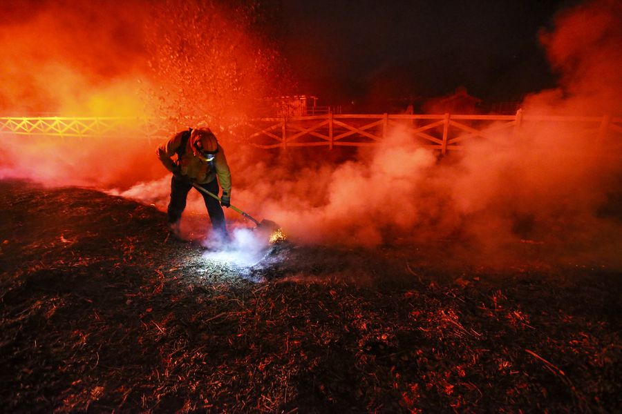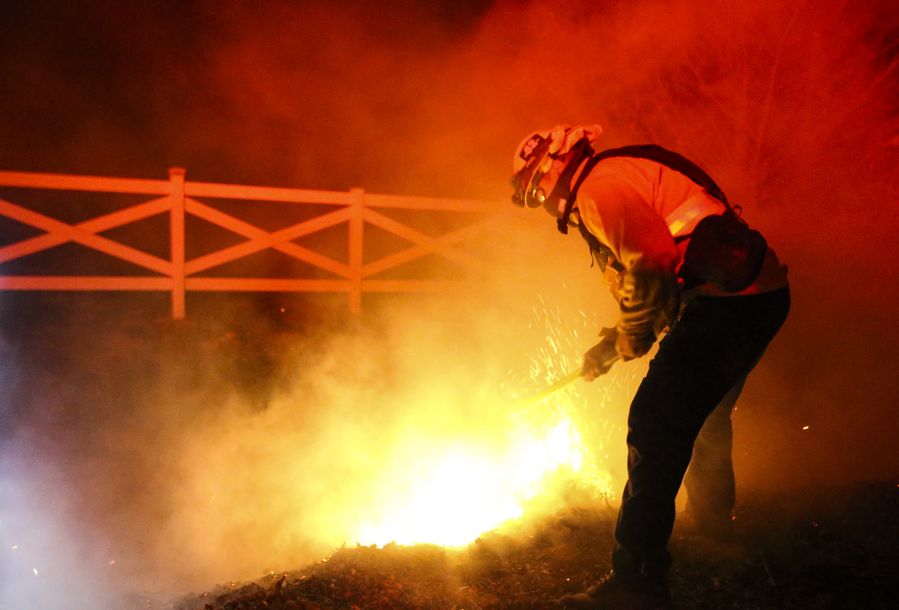 A firefighter tries to put out a fire in Santa Clarita, the U.S. state of California, Oct. 24, 2019. (Xinhua/Li Ying)