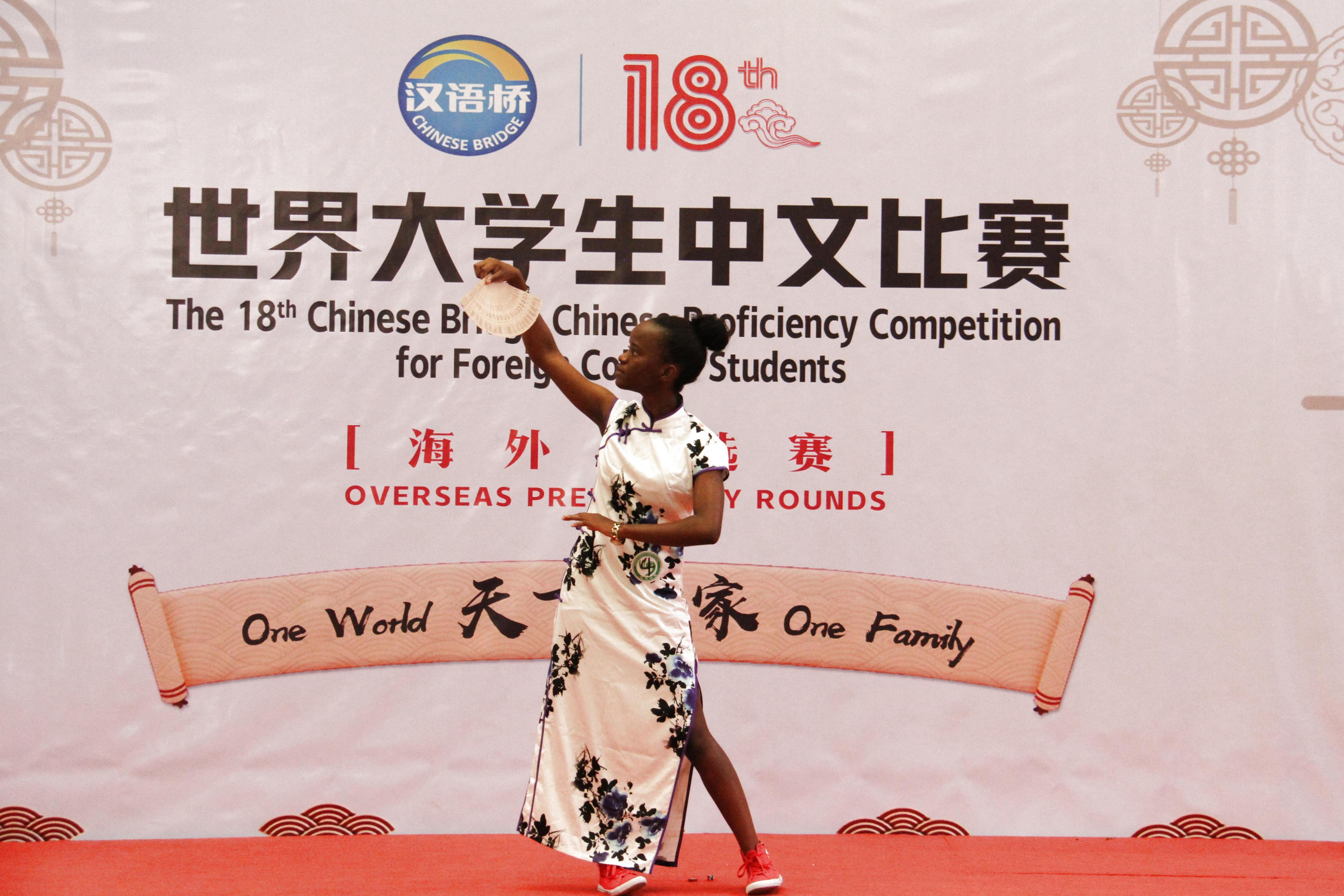 A student takes part in the 18th Chinese-Bridge Chinese Proficiency Competition for college students in Windhoek, capital of Namibia, April 23, 2019. (Xinhua/Wu Changwei)
