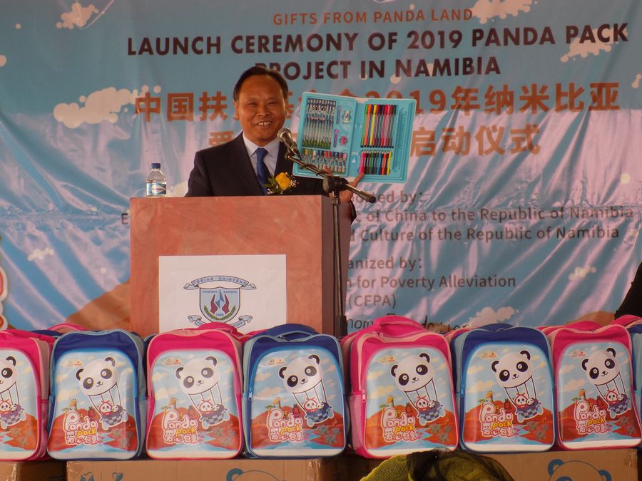 The China Foundation for Poverty Alleviation donates 40, 000 Panda Packs with stationery in Namibia. The donation helps the students who used to carry learning materials in plastic bags, conveys the Chinese people's kindness and will deepen the friendship between the two nations.