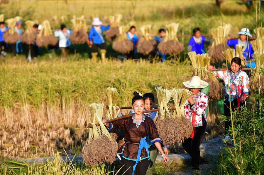Farmers of the Miao ethnic group carry bales of purple glutinous rice at Yuanbao Village in Antai Township in Rongshui Miao Autonomous County, south China's Guangxi Zhuang Autonomous Region, Oct. 30, 2018. (Xinhua/Huang Xiaobang)
