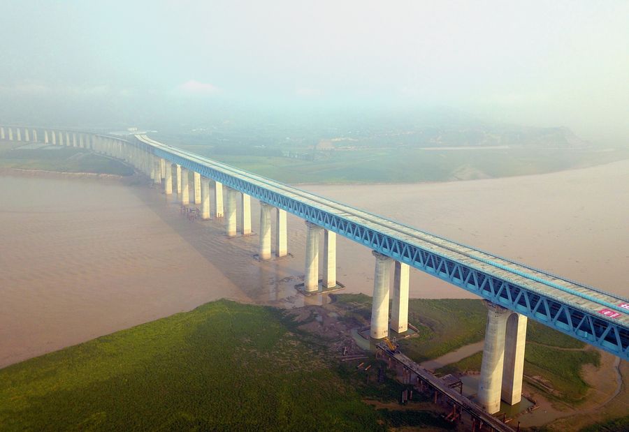 Aerial photo taken on Sept. 18, 2019 shows a Yellow River highway-railway bridge on the Haoji Railway in China. (Photo by Tang Zhenjiang/Xinhua)
