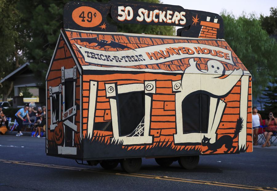 Halloween decorations are seen during Anaheim Halloween Parade, Oct. 26, 2019. (Xinhua/Li Ying)