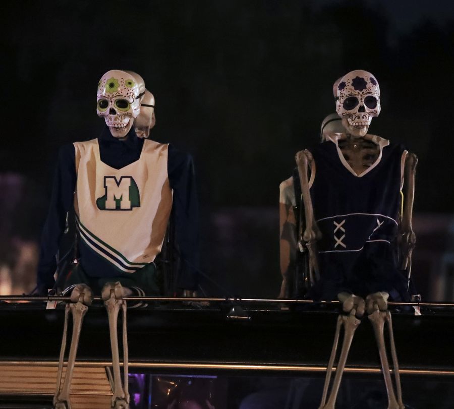 Skeleton props are displayed during Anaheim Halloween Parade, Oct. 26, 2019. (Xinhua/Li Ying)