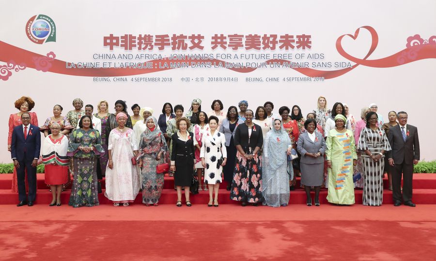 Peng Liyuan (C, front), the wife of Chinese President Xi Jinping, together with spouses of African heads of state and government attend a China-Africa meeting on HIV/AIDS prevention and control in Beijing, capital of China, Sept. 4, 2018. (Xinhua/Ding Haitao)