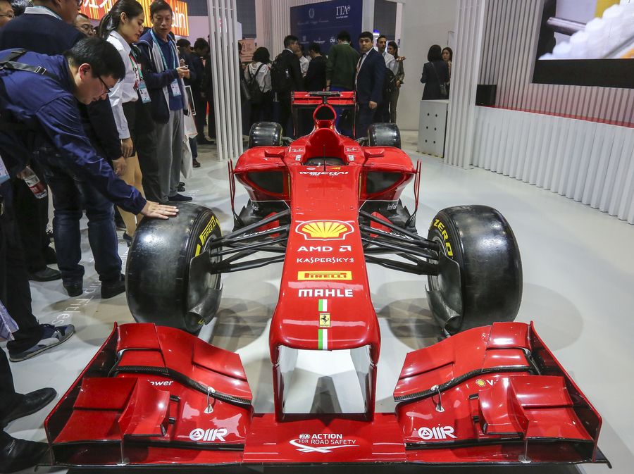 People watch a model of F1 formula racing car at the Italy booth during the first China International Import Expo (CIIE) in Shanghai, east China, Nov. 6, 2018.(Xinhua/Yin Gang)