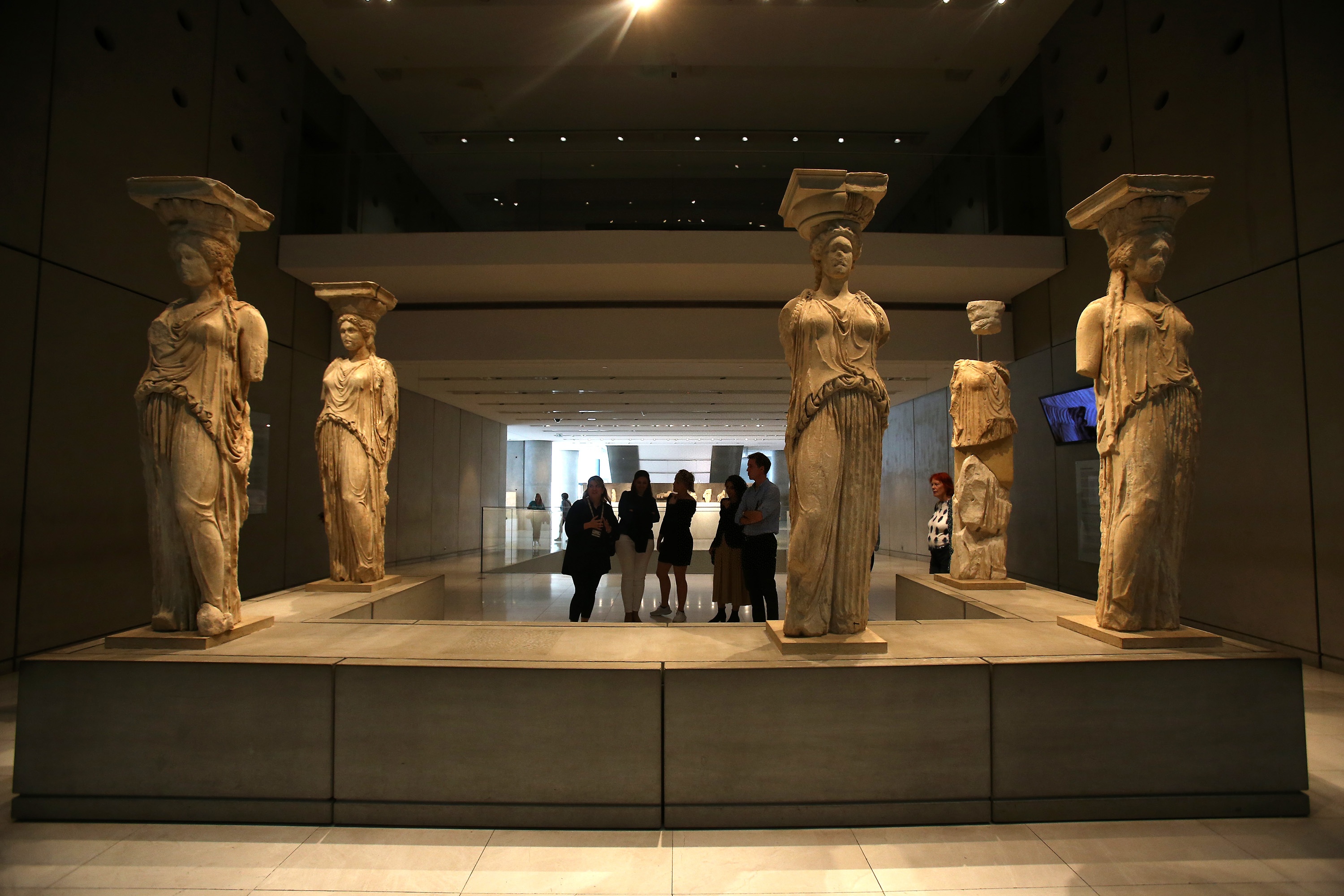 Visitors look at Caryatids of the Erechtheion at the Acropolis Museum in Athens, Greece, Nov. 7, 2019. (Xinhua/Marios Lolos)