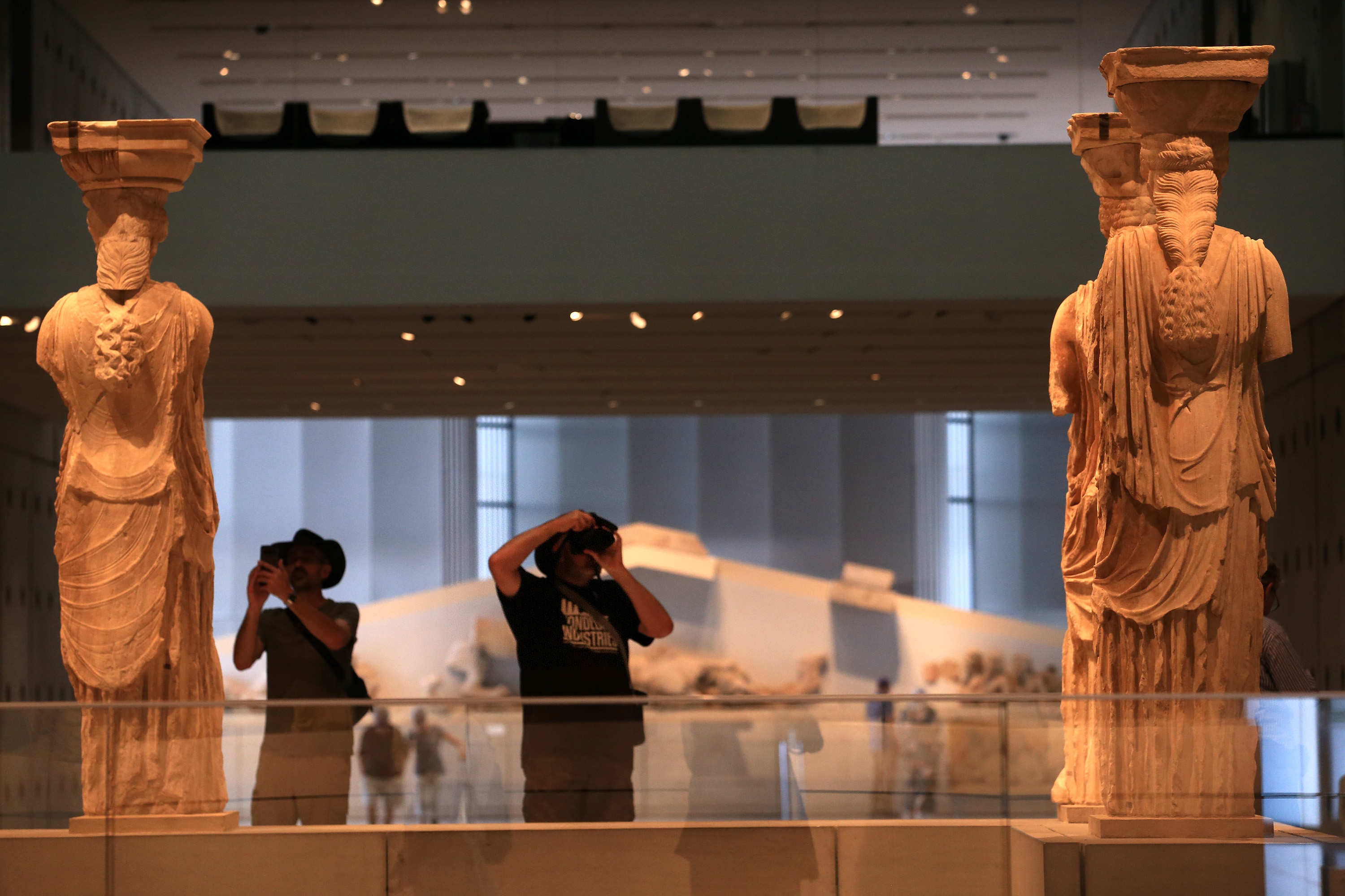 Visitors take photos of Caryatids on display at the Acropolis Museum in Athens, Greece, Nov. 7, 2019. (Xinhua/Marios Lolos)