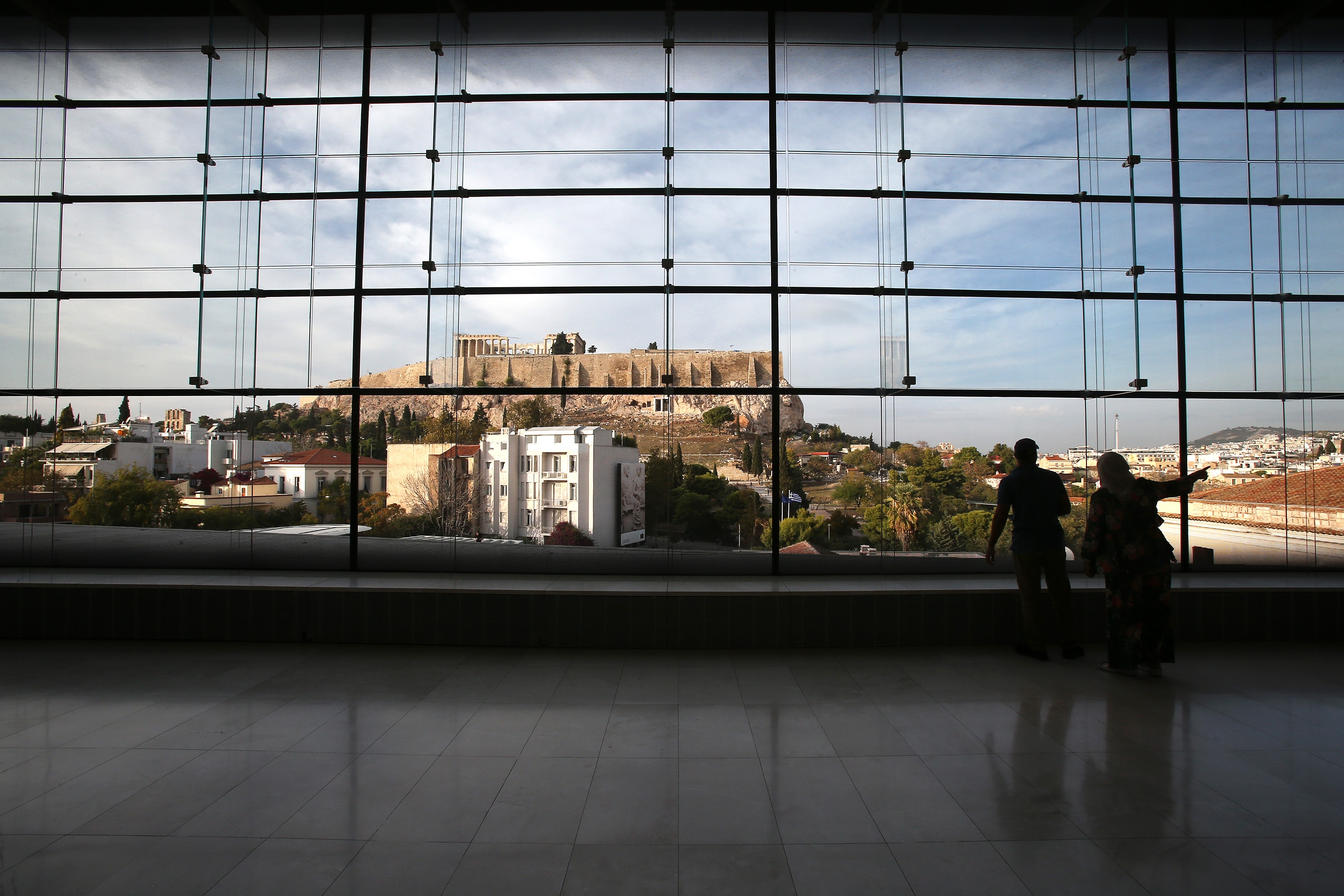 Visitors look at the Parthenon from a distance at the Acropolis Museum in Athens, Greece, Nov. 7, 2019. (Xinhua/Marios Lolos)