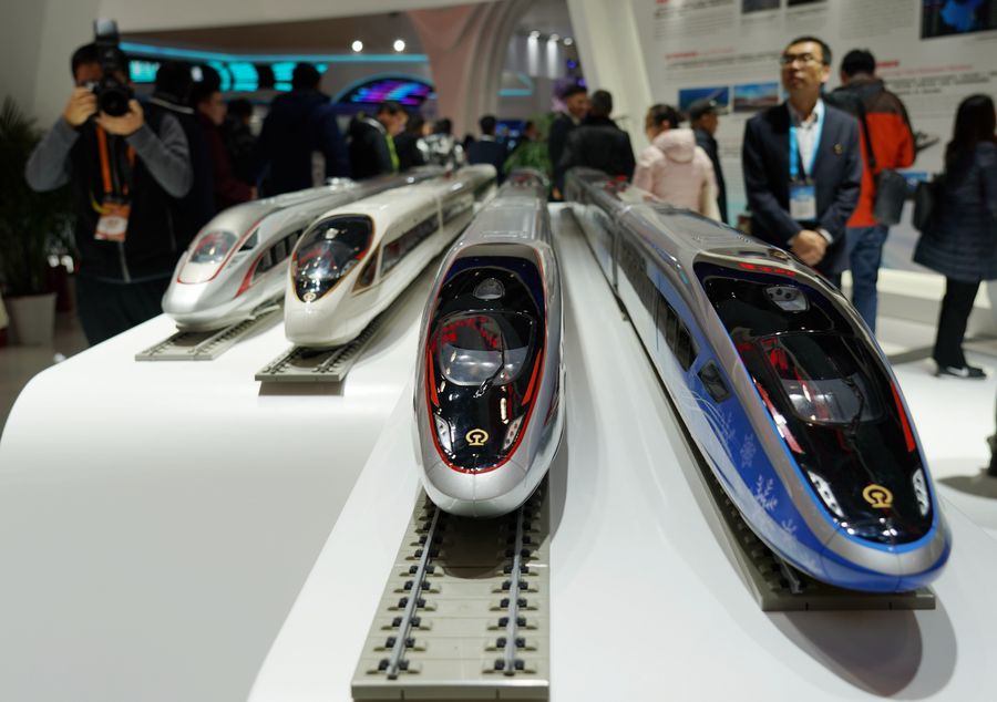 Various electric multiple unit (EMU) train models are on display during Modern Railways 2019, an international exhibition on modern railway technology and equipment, at China National Convention Center in Beijing, capital of China, Nov. 20, 2019. (Xinhua/Zhang Chenlin)
