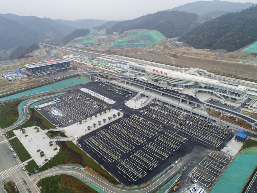 Aerial photo taken on Nov. 27, 2019 shows Shiyan East Railway Station of Wuhan-Shiyan high-speed railway in central China's Hubei Province. (Xinhua/Xiong Qi)