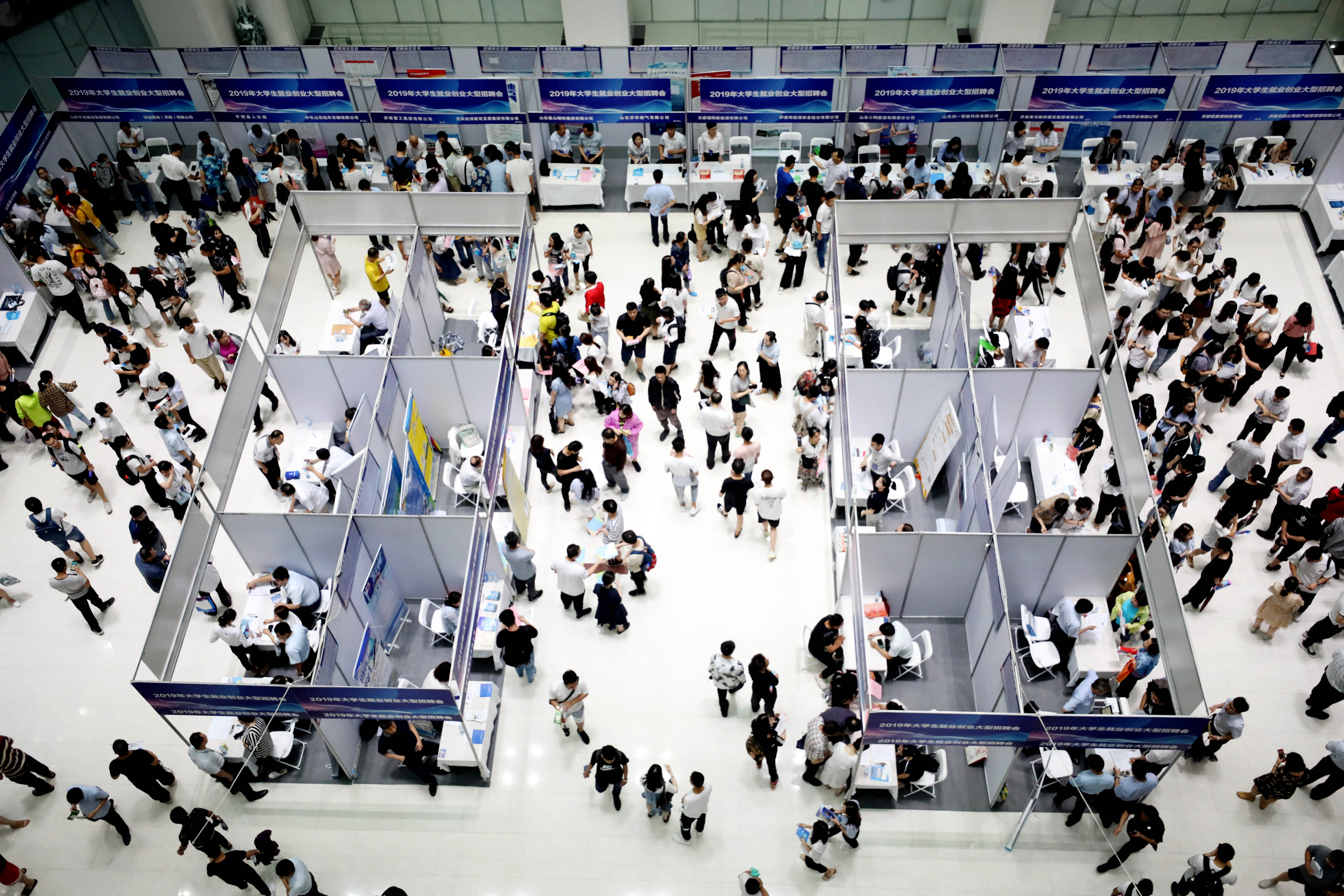 Job seekers attend a job fair aimed at university and college graduates in Jinan, east China's Shandong Province, July 6, 2019. (Photo by Zhao Xiaoming/Xinhua)