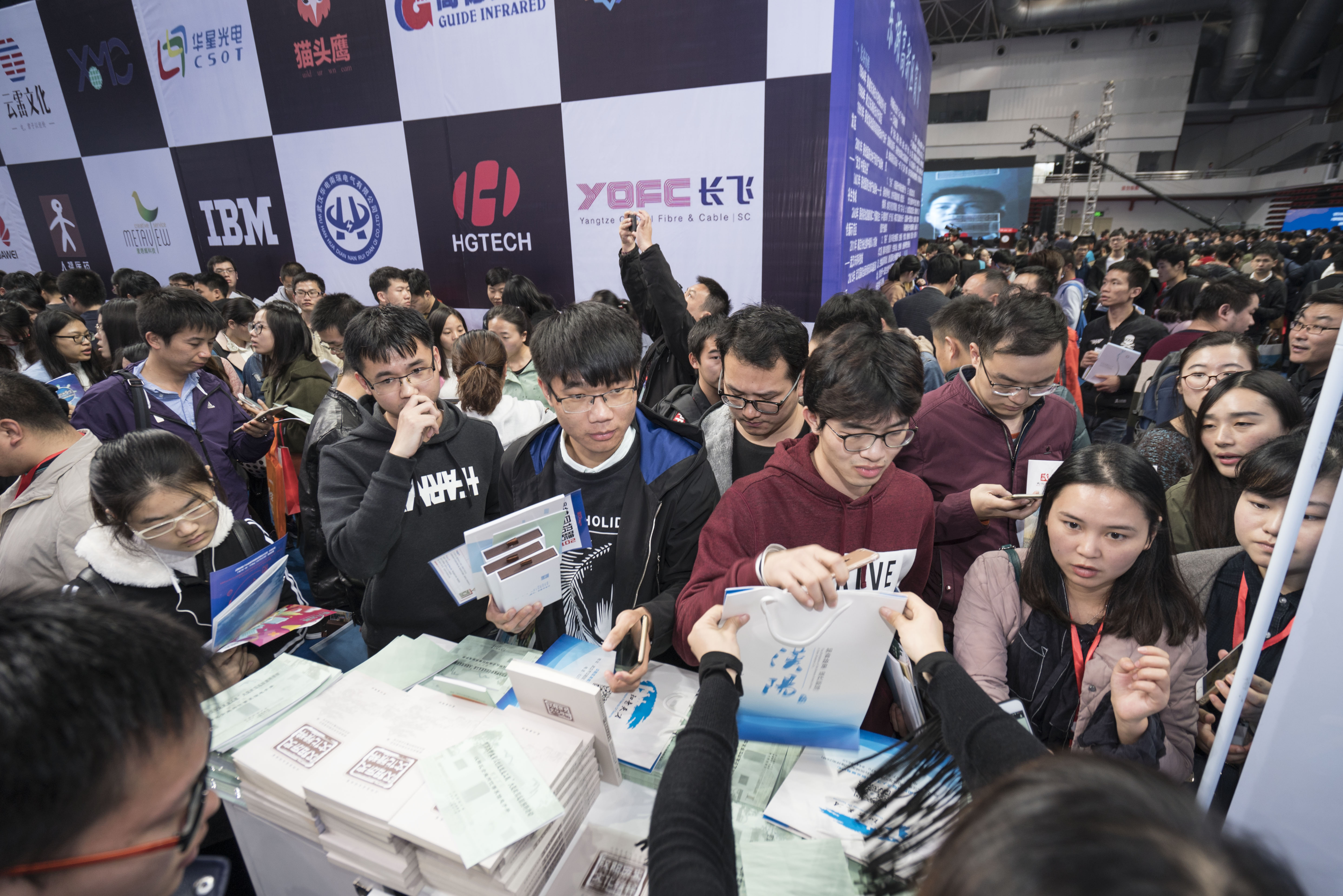 Applicants check information during a job fair in Wuhan, capital of central China's Hubei Province, Nov. 12, 2017. (Xinhua/Xiong Qi)