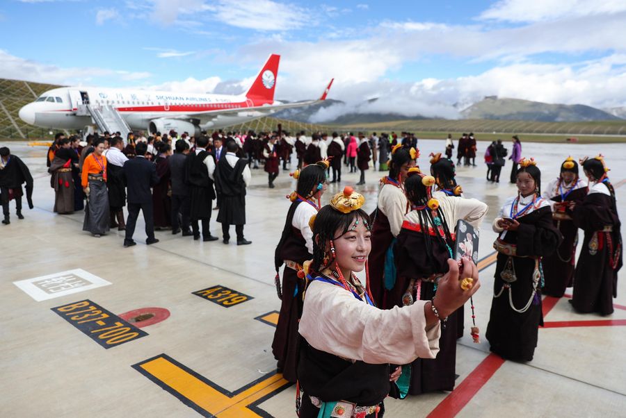 A Tibetan girl takes selfies at the Garze Gesar Airport in the Tibetan Autonomous Prefecture of Garze, southwest China's Sichuan Province, Sept. 16, 2019. (Xinhua/Jiang Hongjing)