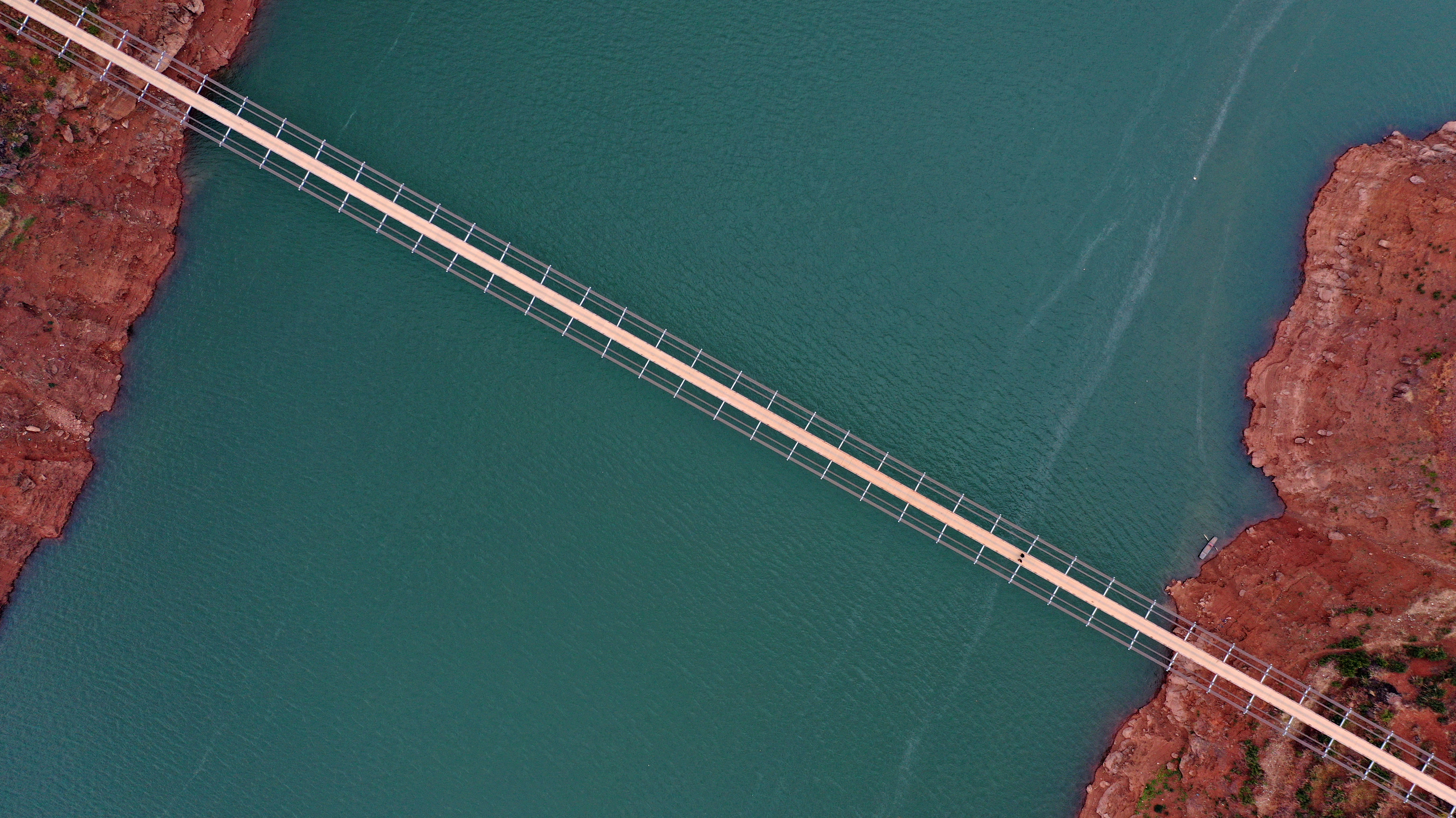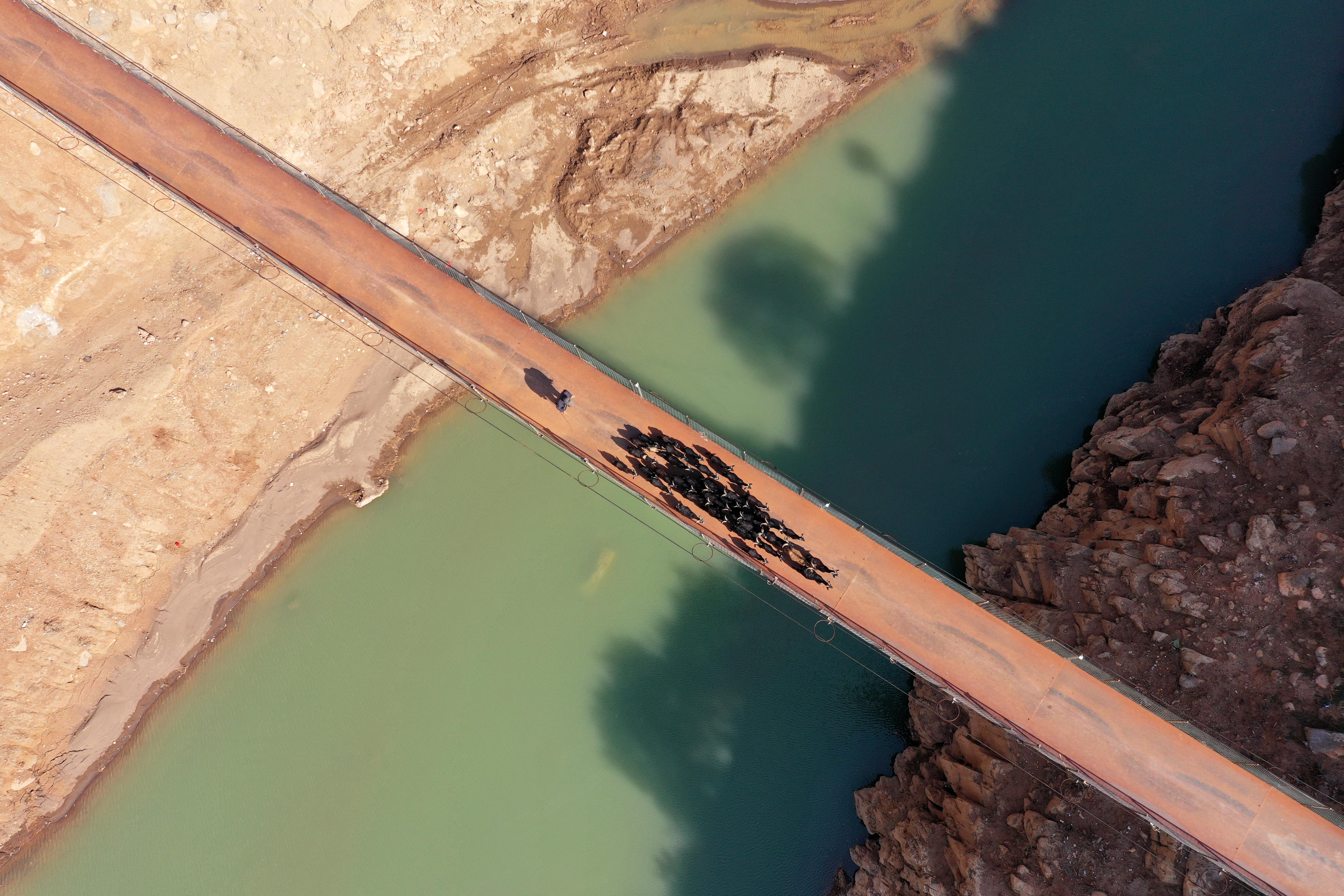 Aerial photo taken on Dec. 12, 2019 shows a man herding the sheep on a bridge spanning the Niulan River in southwest China. (Xinhua/Yang Wenbin)
