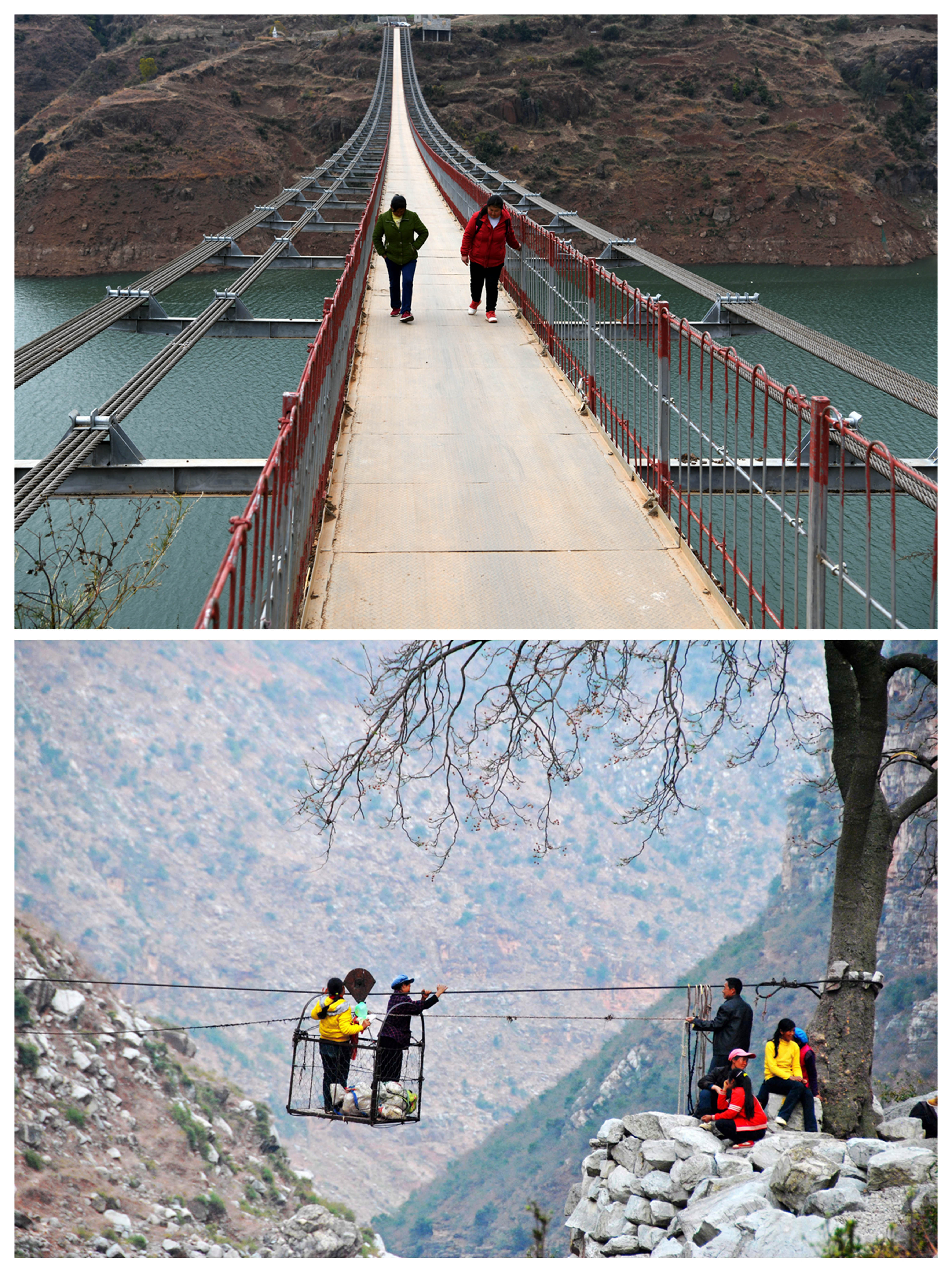 Combo photo shows a villager walking on a bridge (upper) linking Weining County in southwest China's Guizhou Province and Huize County in southwest China's Yunnan Province on March 13, 2018 and people of Huize using cableway (lower) on March 7, 2013. (Xinhua/Yang Wenbin)
