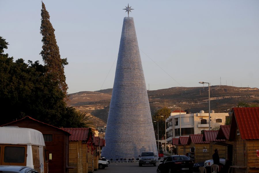A 28.5-m tall Christmas tree made with 129,000 plastic bottles in Lebanon shows a message to preserve environment by saving a big amount of plastic bottles for recycle.