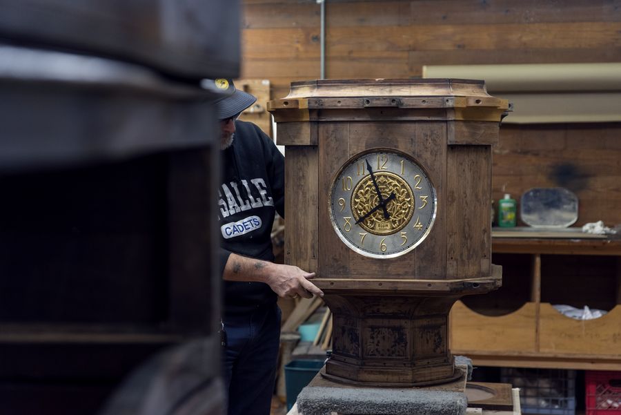 The 1893 World's Fair Clock undergoes cleaning and renovation in New York, the United States, Oct. 24, 2019. (Xinhua)