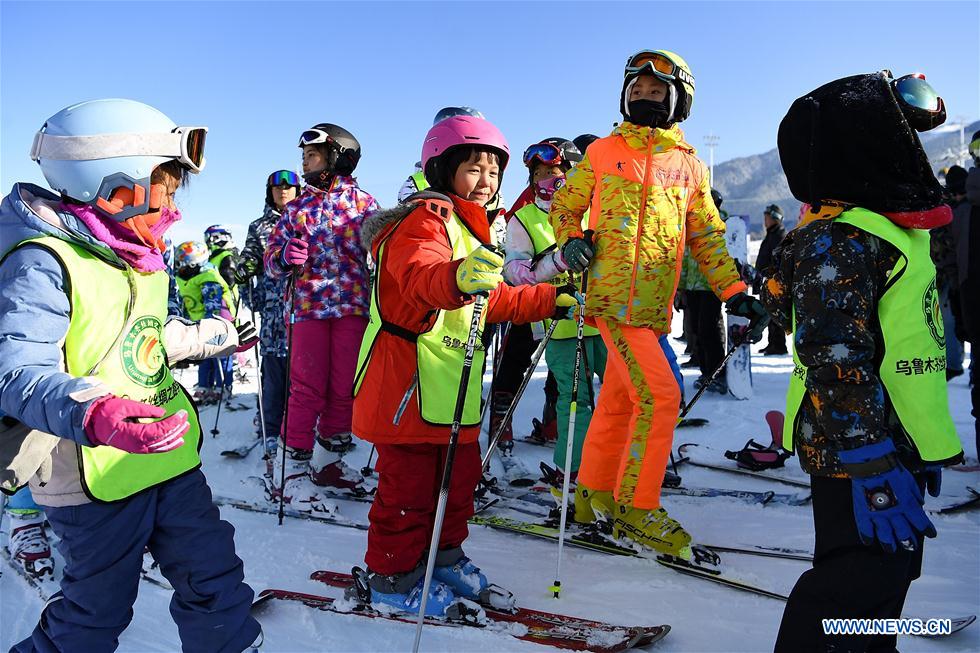 Children prepare to ski during the Urumqi Silk Road Ice & Snow Festival in Urumqi, northwest China's Xinjiang Uygur Autonomous Region, Dec. 23, 2019. The 17th Urumqi Silk Road Ice & Snow Festival opened Monday in Urumqi, and will last till April of 2020. (Xinhua/Song Yehua)