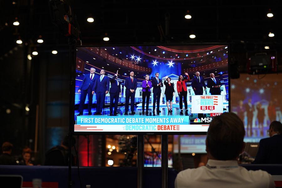 Ten Democratic contenders for the 2020 U.S. presidency take the stage at the party's first primary debate in Miami, Florida, the United States, June 26, 2019. (Xinhua)