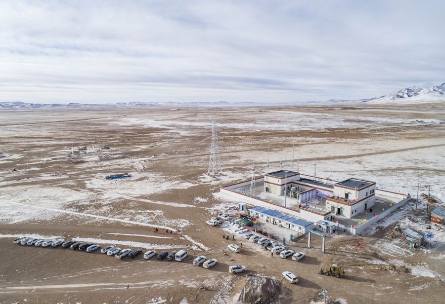 Aerial photo taken on Dec. 24, 2019 shows a 110 kV power transmission station in Tsonyi County, Nagqu City, southwest China's Tibet Autonomous Region. The world's highest county, Tsonyi, Nagqu City, southwest China's Tibet Autonomous Region, was connected to China's state grid Tuesday, enabling a stable power supply for more than 7,000 local residents. (Xinhua/Sun Fei)