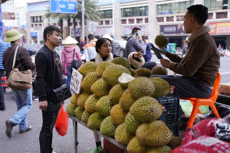 People buy durians from a Vietnamese vendor at Wanzhong International Wholesale Market in Dongxing, south China's Guangxi Zhuang Autonomous Region, Dec. 27, 2019. (Xinhua/Yang Chi)