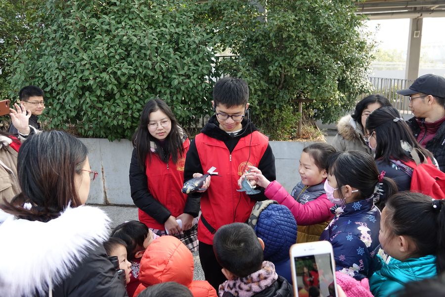 File photo taken on Dec. 23, 2018 shows volunteers introducing the Yangtze finless porpoise to the public in Nanjing, capital of east China's Jiangsu Province. (Nanjing Yangtze Finless Porpoise Conservation Association/Handout via Xinhua)