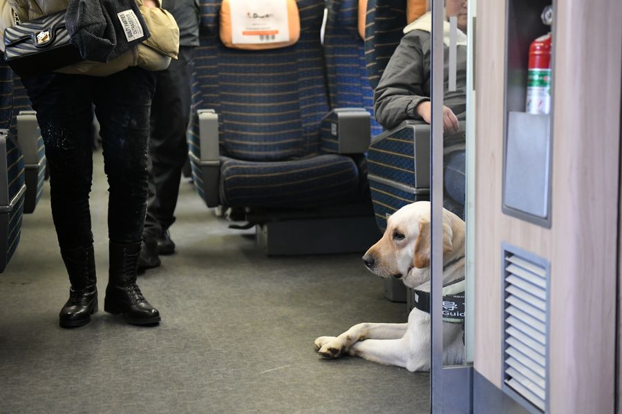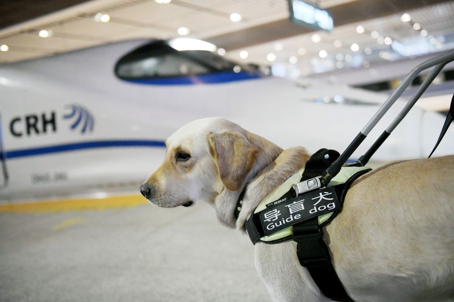 A guide dog waits to board a train at Xi'an North Railway Station in Xi'an, capital of northwest China's Shaanxi Province, Jan. 12, 2020. (Xinhua/Li Yibo)