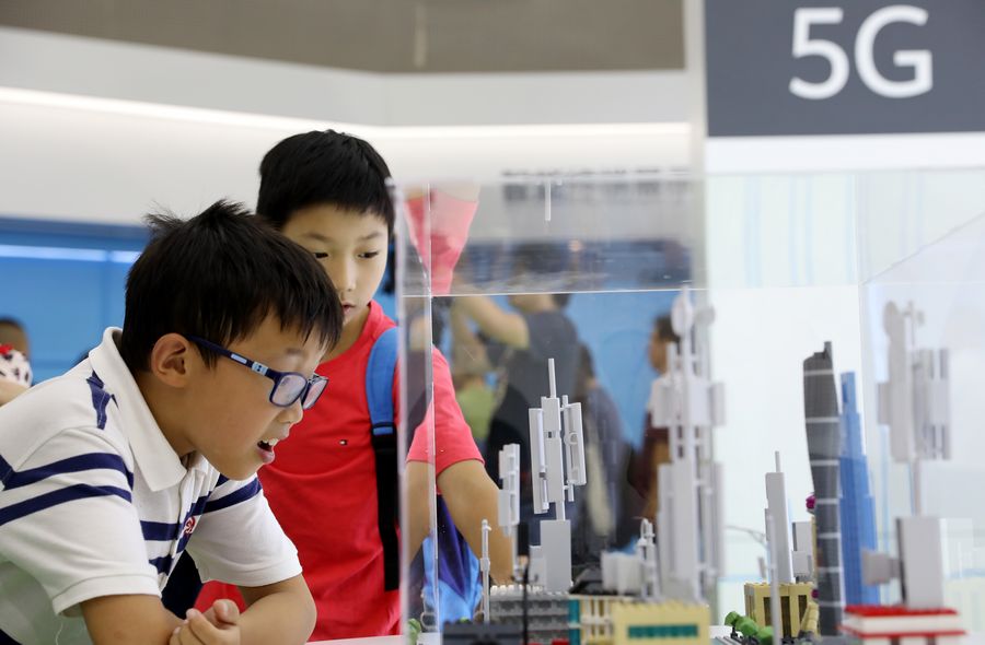 Kids view a model of 5G base station at the Huawei 5G Experience Booth during the preview of the 2019 World Artificial Intelligence Conference in east China's Shanghai, Aug. 26, 2019. (Xinhua/Fang Zhe)